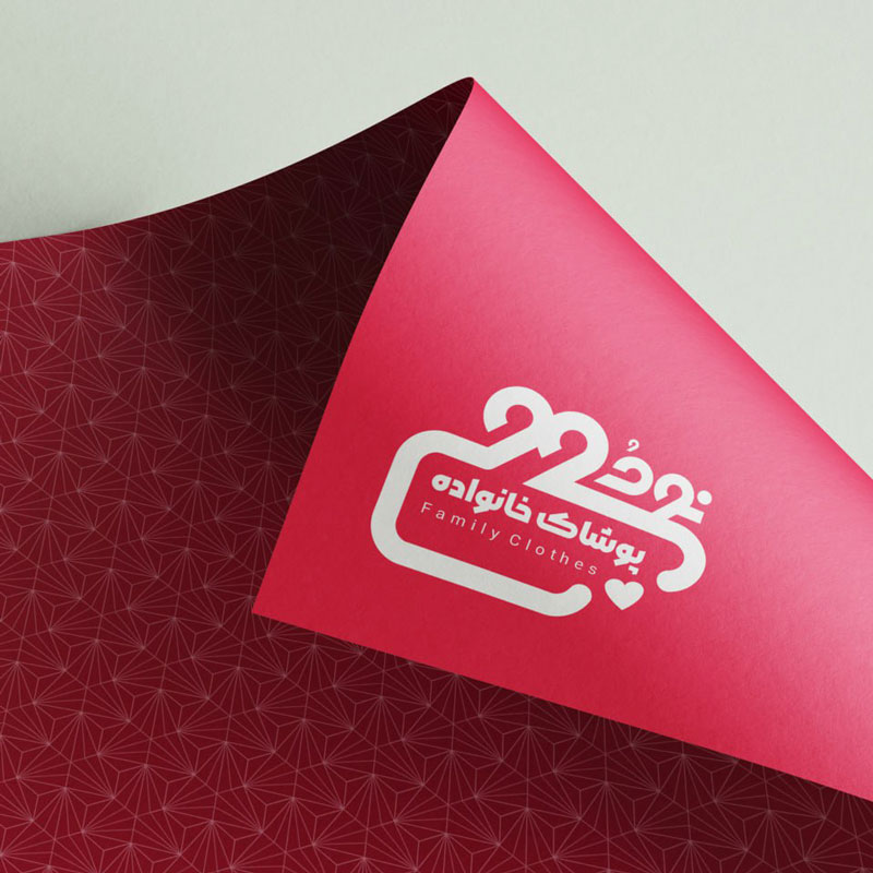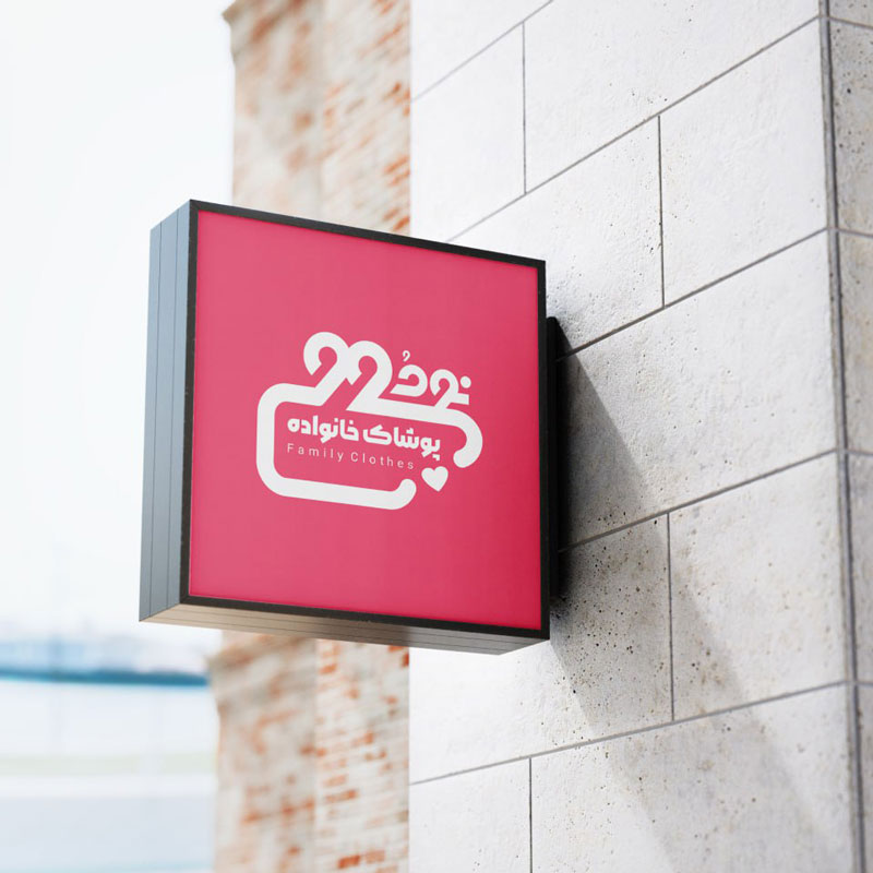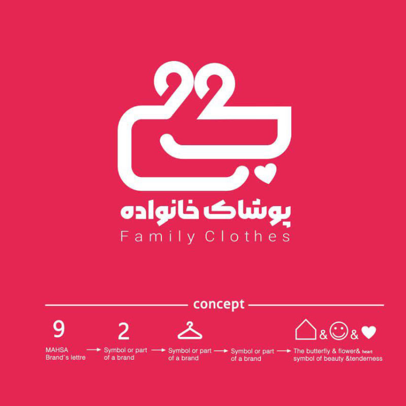 لوگوی «پوشاک خانواده» با فونتی دوستانه طراحی شده تا حس صمیمیت و راحتی خانواده را منتقل کند، تصویر جالباسی که لباس‌ها روی آن آویزان و داخل کمد قرار می‌گیرند، نشان‌دهنده نظم و کاربردی بودن است، رنگ سفید لوگو روی پس‌زمینه صورتی جلوه‌ای روشن و شاد ایجاد کرده و به راحتی جلب توجه می‌کند و ترکیب ساده فونت و تصویر جالباسی، حس گرم، خانوادگی و دوستانه برند را تقویت می‌کند.